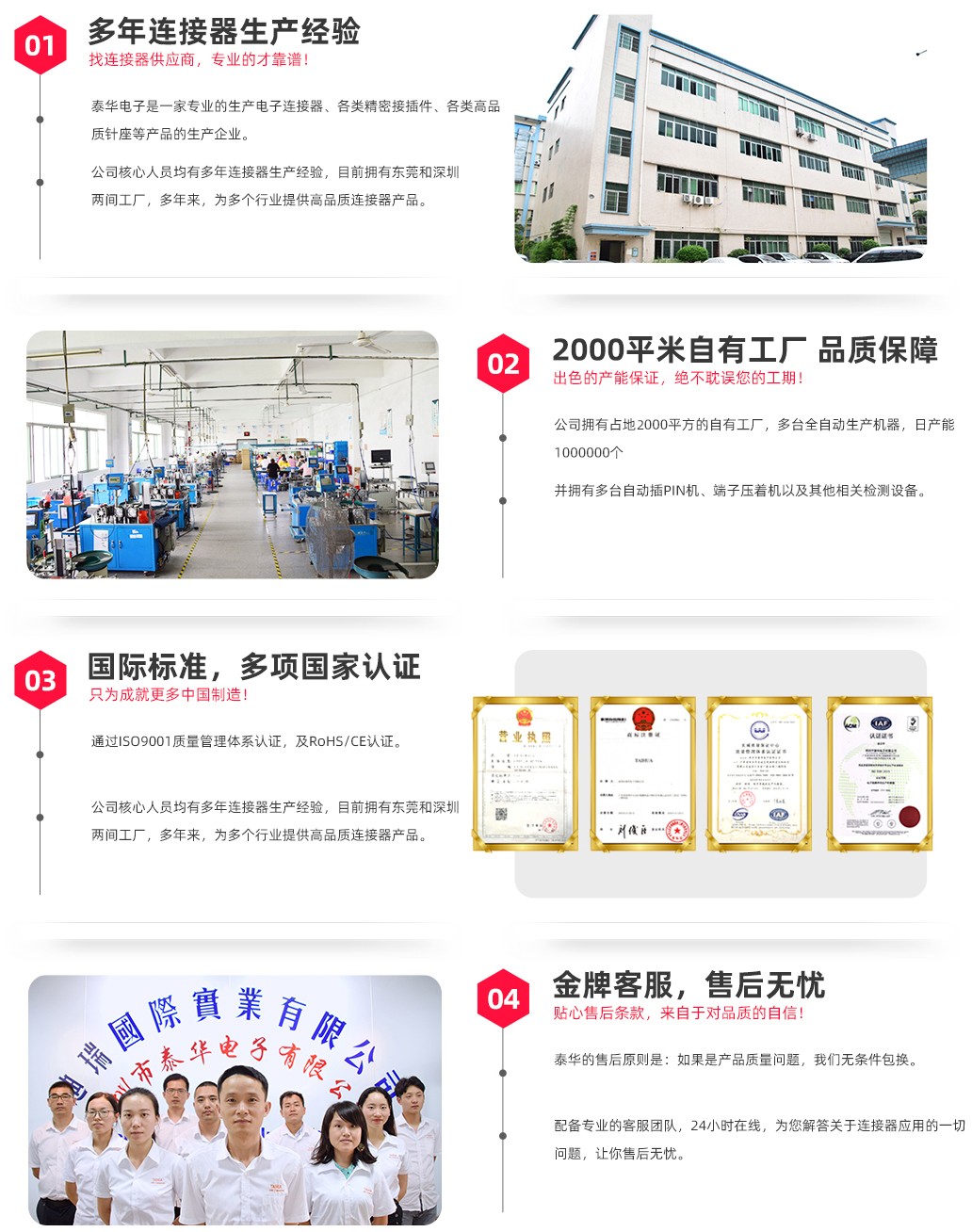 深圳市泰華電子有限公司15年專注連接器,多來成功為全國2000家大中小型企業(yè)提供專業(yè)的技術(shù)和服務。本公司具備先進的生產(chǎn)設(shè)備,標準化生產(chǎn)流程接插件日產(chǎn)100萬。所有產(chǎn)品通過ISO9001、ROHS等認證,自成立以來一直秉承品質(zhì)為先,客戶至上的理念。
